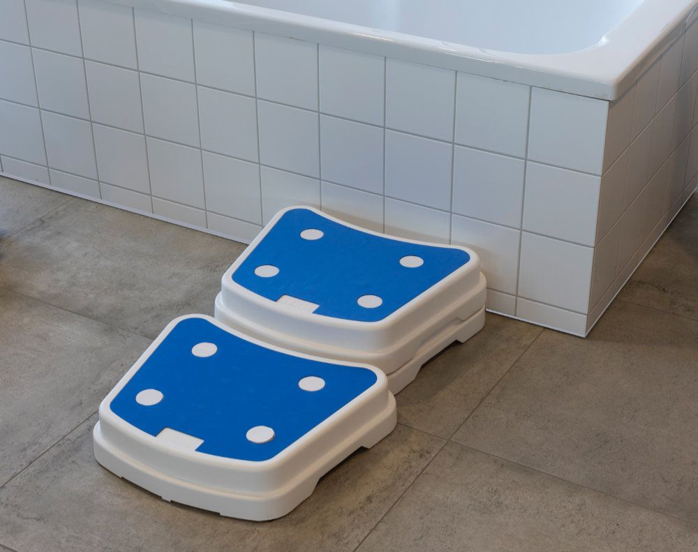 Die Badestufe stapelbar im 3er-Set erleichtert Ihnen als einzelne Stufe oder gestapelt das sichere Einsteigen in bzw. aus der Badewanne oder in eine erhöhte Duschwanne und fördert somit Ihre Sicherheit und Eigenständigkeit bei der selbstständigen hygienischen Pflege im Bad. Ihr Material ist optimal für Nassräume wie Ihr Bad geeignet. Dank der besonderen Textur der blauen, angenehm weichen und rutschsicheren Trittauflage bietet die Badestufe auch mit nassen Füßen einen sicheren Halt. Die große Trittfläche mit einem Maß von 36/46 x 35 cm ermöglicht Ihnen das sichere Gefühlt beim Ein- und Ausstieg. Zahlreiche Gummifüße an der Unterseite sorgen für eine hohe Standsicherheit auf Ihren Badezimmerfliesen. Dank des geringen Eigengewichts kann die Badestufe bei Nichtbedarf leicht entfernt werden.