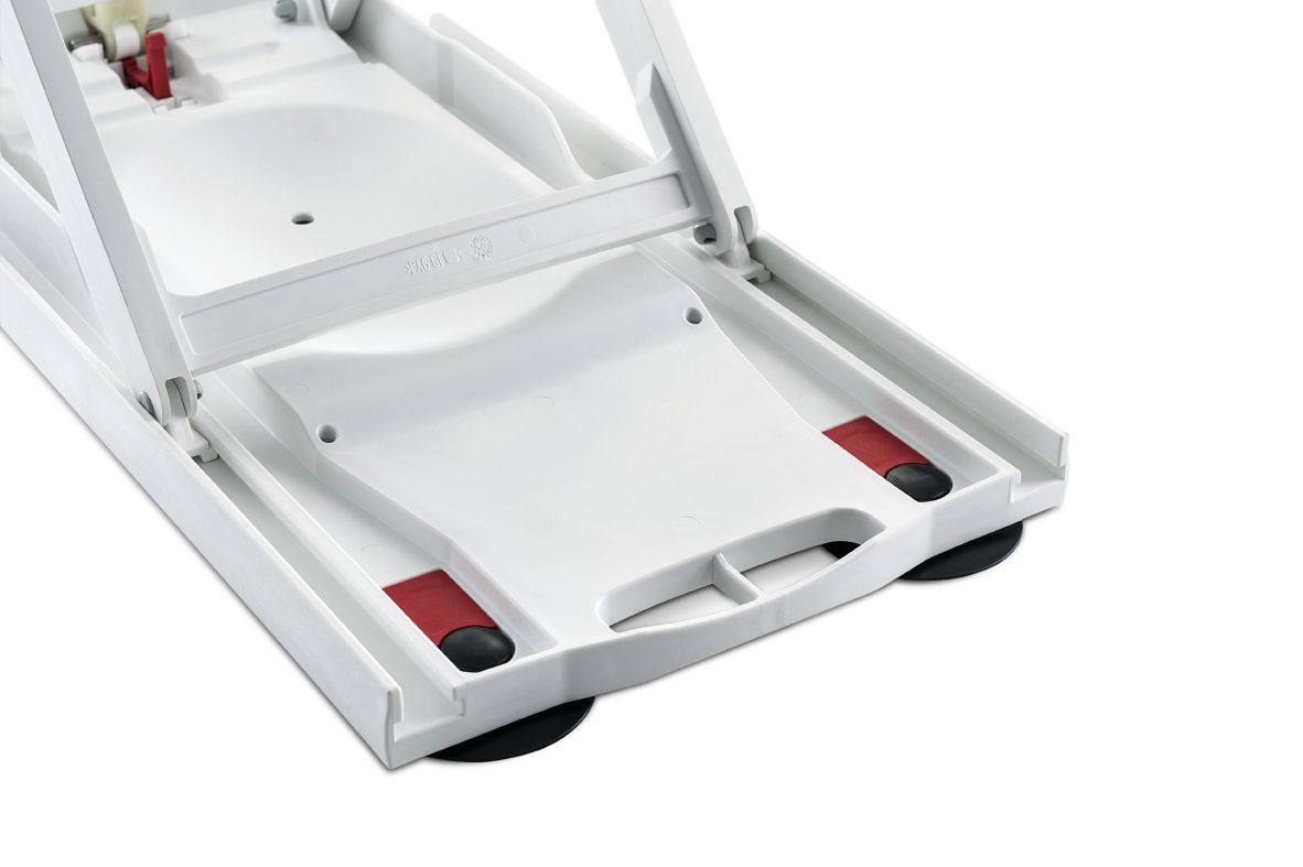 - Die patentierten, selbst belüftenden Sauger unter der Grundplatte des Badewannenlifts lassen sich ganz leicht lösen.