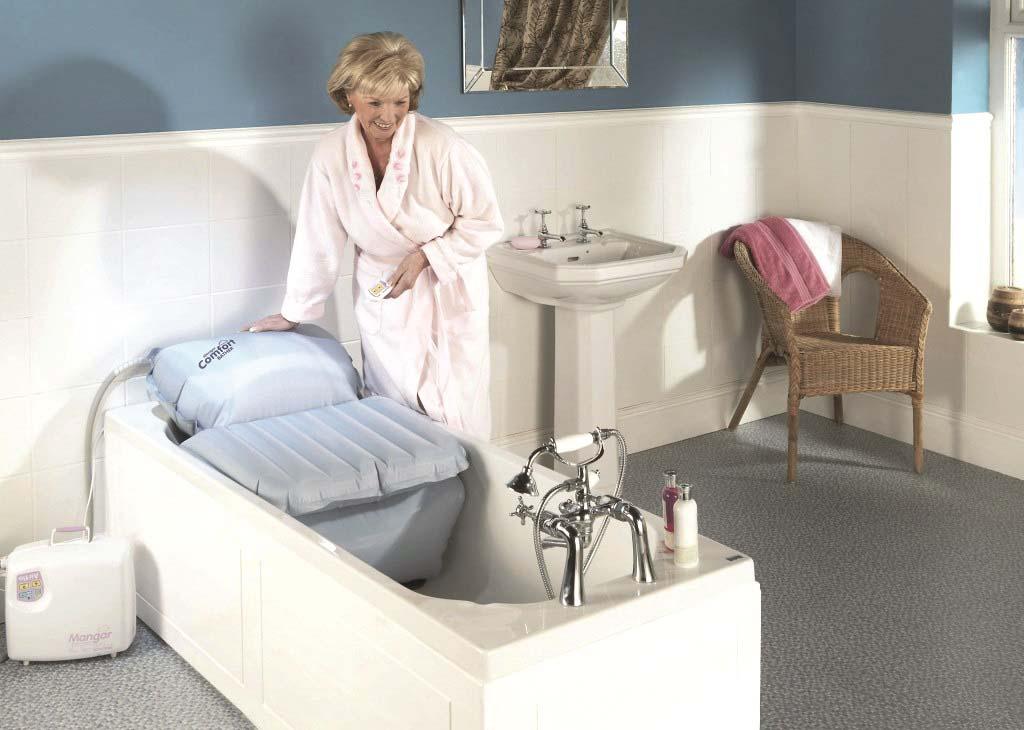 Besitzen Sie eine kurze Badewanne, dann finden Sie mit dem Luftpolster Badekissen Mangar einen Badelift für die Wanne, der Ihnen gewohnt genügend Freiraum beim Baden auch für die Beine bietet. Sie haben Probleme beim Ein- bzw. Ausstieg aus Ihrer Wanne oder dem Hinsetzen und Aufstehen vom Wannenboden? Mangar ist die passende Alternative zu herkömmlichen Badewannenliftern.