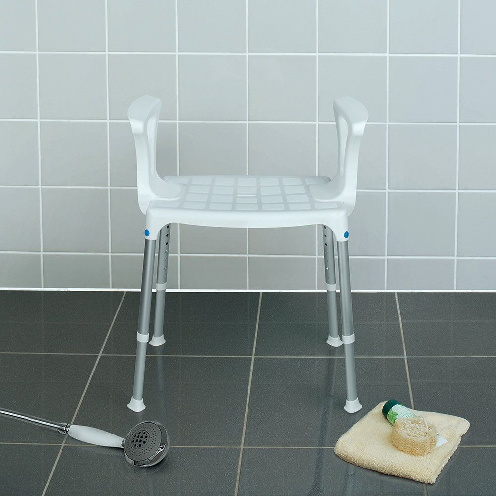 Als 7-fach höhenverstellbarer Duschhocker mit einer Sitzhöhe von 39 bis 54 cm bieten der Badhocker Laguna Ihnen als Hilfsmittel aus dem Sanitätshaus die Möglichkeit der individuellen Einstellung. Seine stützenden Armlehnen geben die nötige Sicherheit und Unterstützung beim Hinsetzen und Aufstehen. Diese zeichnen sich durch ihre angenehm breite Auflagefläche sowie die werkzeuglose, sehr einfache Montage aus.