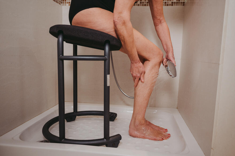 - Sie haben beide Füße sicher auf dem Boden, fassen die stabilen Haltegriffe seitlich der Sitzfläche vom Duschhocker Spa und drehen sich auf der Stelle in der Dusche, indem Sie die Drehung mit der Fußbewegung unterstützen.