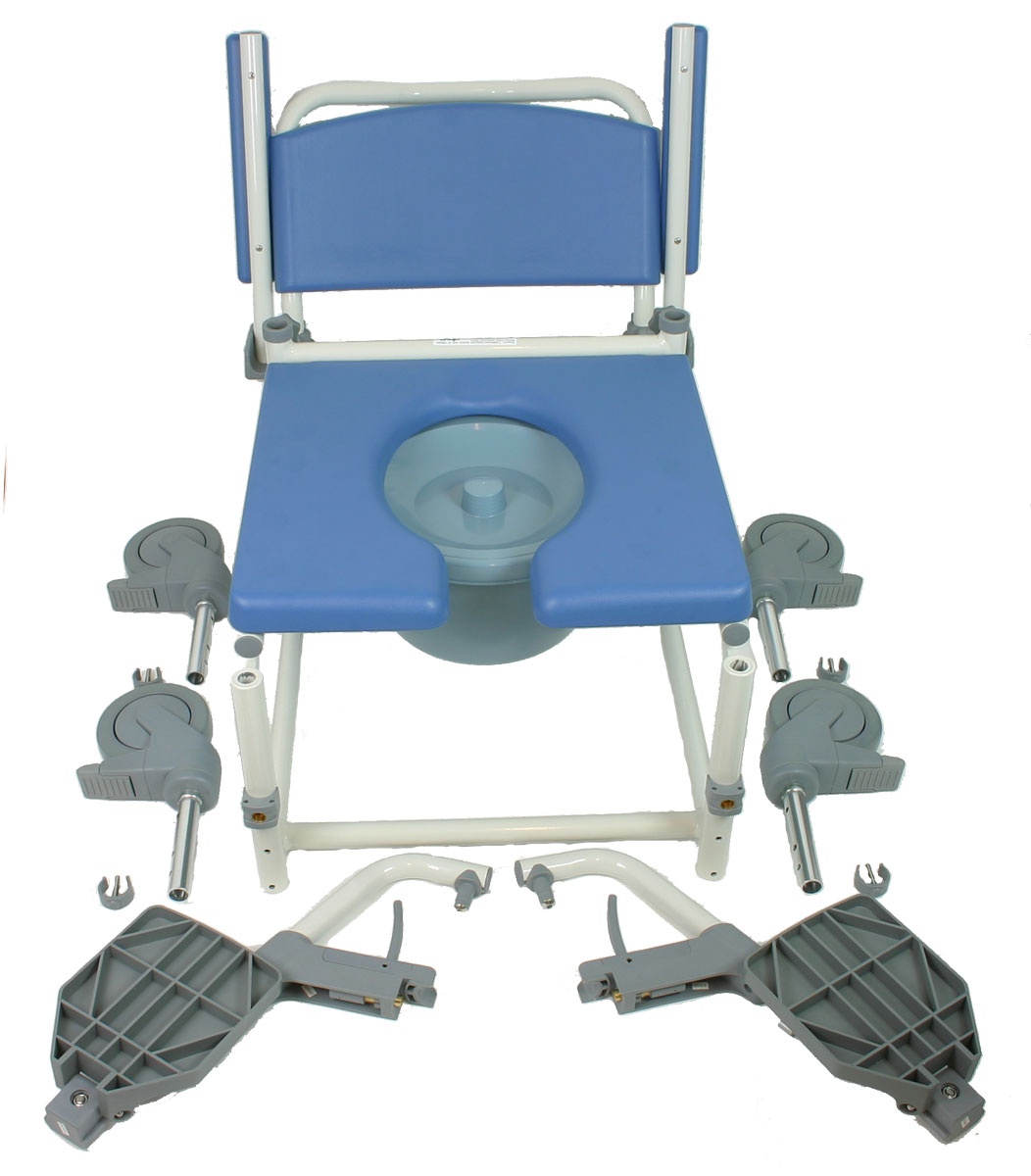 Der mitgelieferten Toiletteneimer des fahrbaren Toilettenstuhles mit Rädern ist nach hinten hin entnehmbar. Die schwenkbaren Fußstützen mit Fersenband sind stufenlos höhenverstellbar von 32,5 cm bis 50,0 und können abgenommen werden. Die Fußauflagen zum einfacheren Hinsetzen- und wieder Aufstehen können Sie hochklappen.