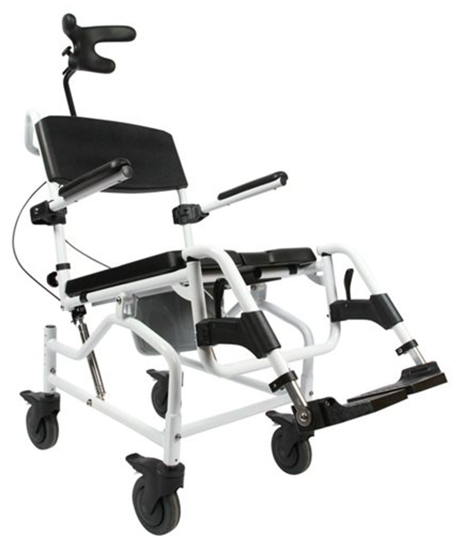Nutzen Sie den Mobilex Dusch– und Toilettenrollstuhl Kakadu Tilt mit Sitzkantelung bei erhöhtem Pflegebedarf Ihrer Patienten für den Transport innerhalb der Häuslichkeit und während der Körperpflege. Serienmäßig wird der Kakadu Tilt mit vier 5-Zoll-Rädern mit Feststellbremsen, Kopfstütze, WC-Eimer mit Deckel und Abdeckung für die Hygieneöffnung geliefert.