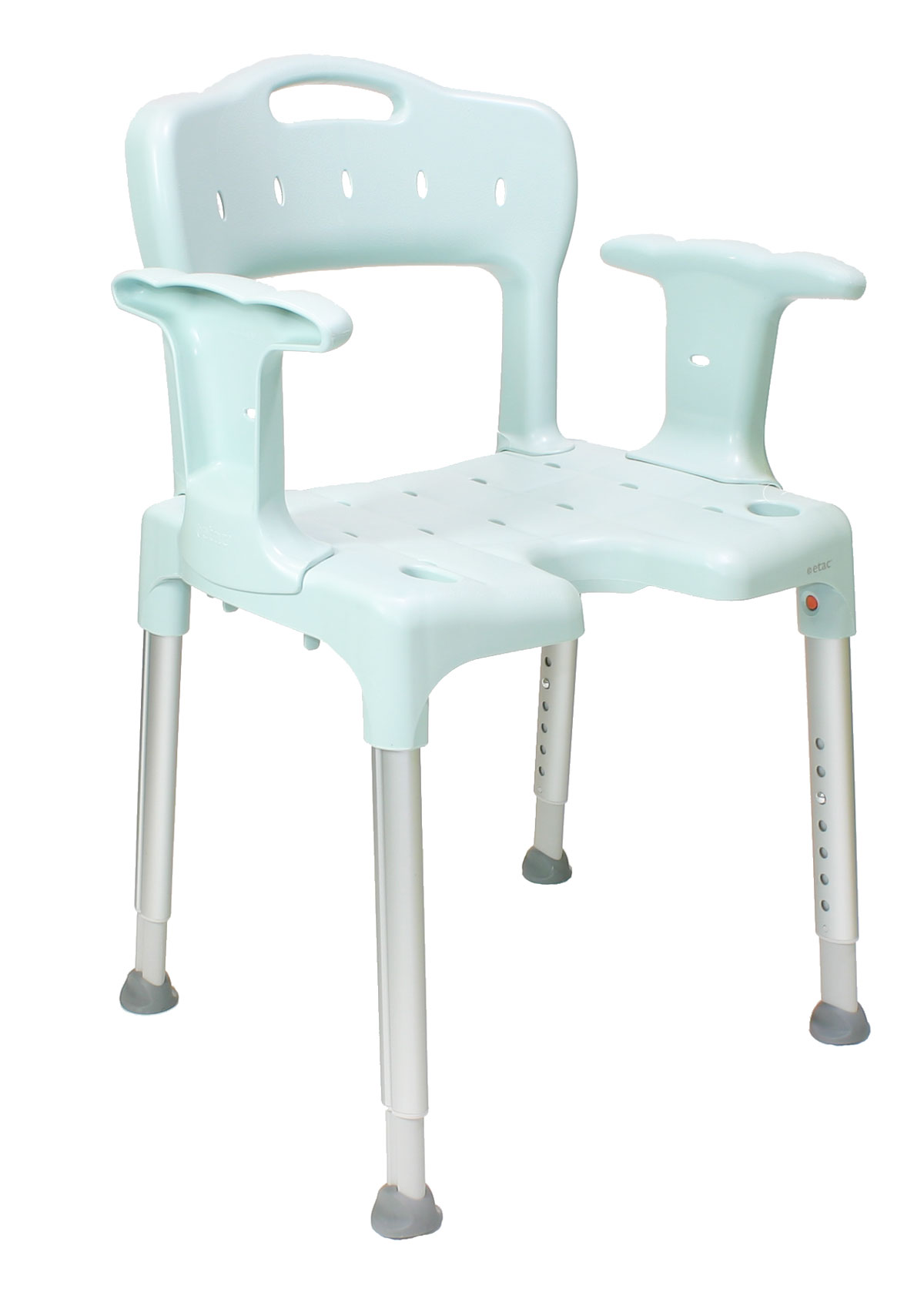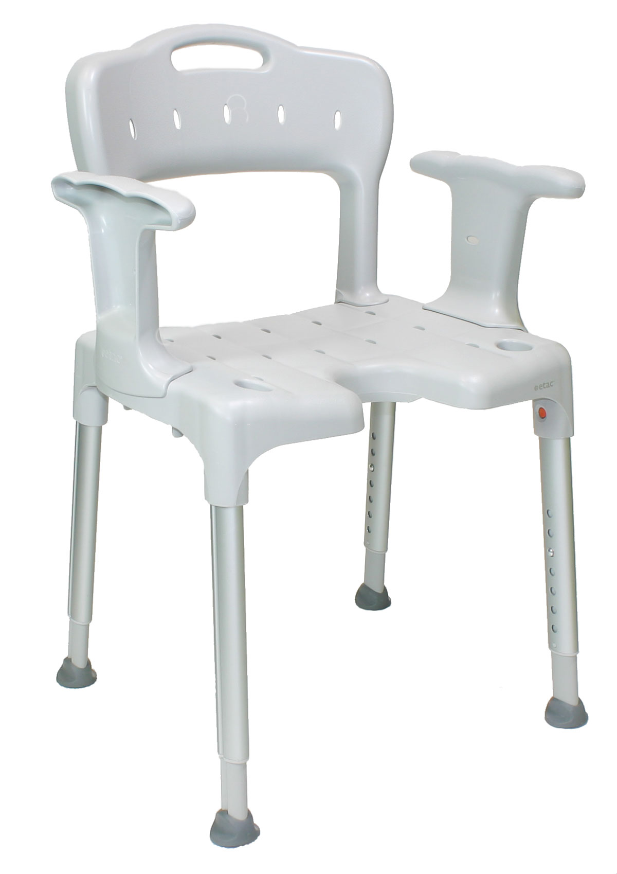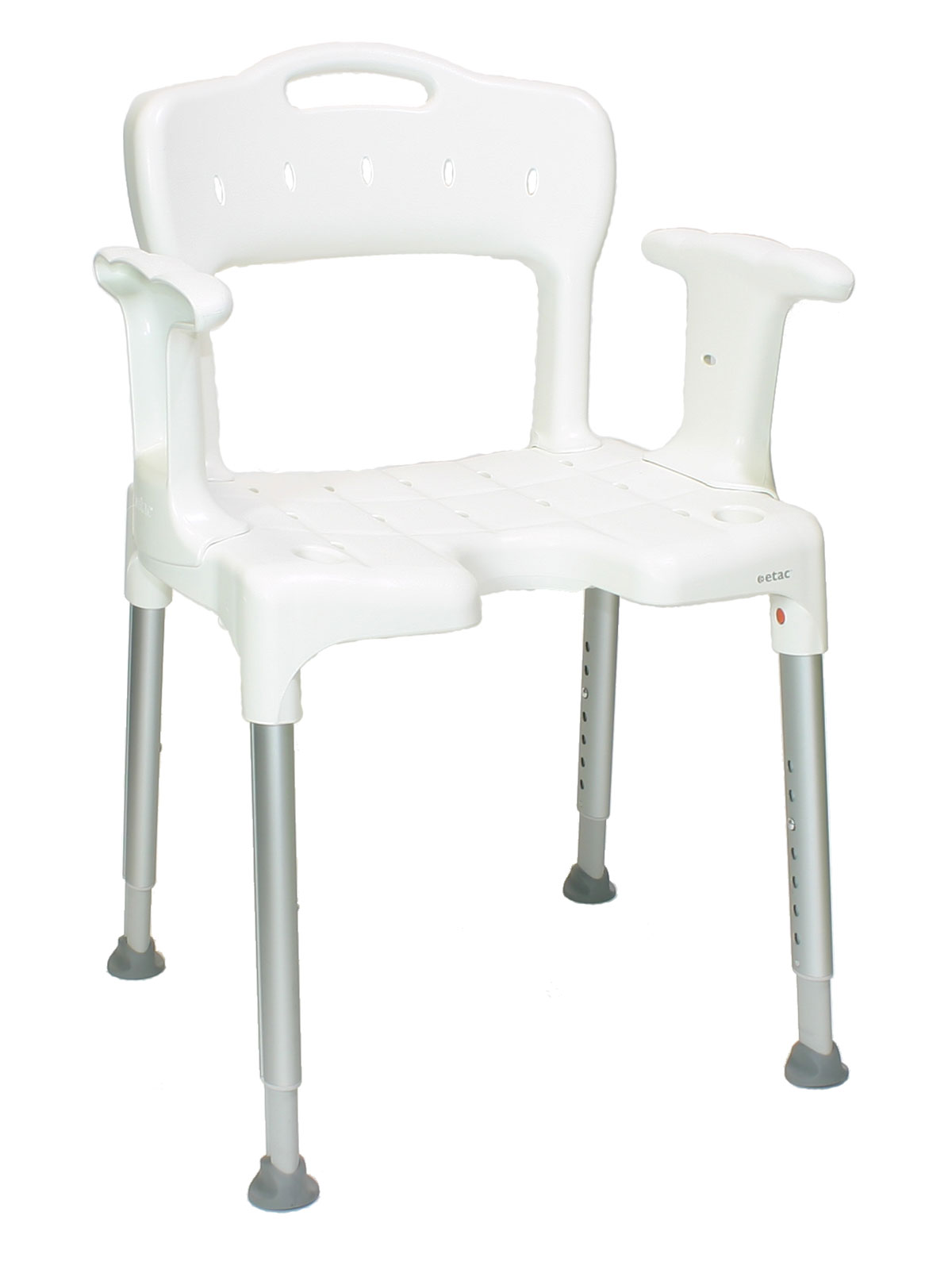 Die Sitzfläche ist mit Wasserablauflöchern und einem Hygieneausschnitt für die Intimpflege ausgestattet. Die Oberflächenstruktur der Sitzfläche und der Armlehnen sorgt für einen sicheren, rutschfesten Halt, während Sie den Etac Swift Duschstuhl als Sitzgelegenheit für die Körperpflege in der Dusche oder vor dem Waschbecken nutzen.
