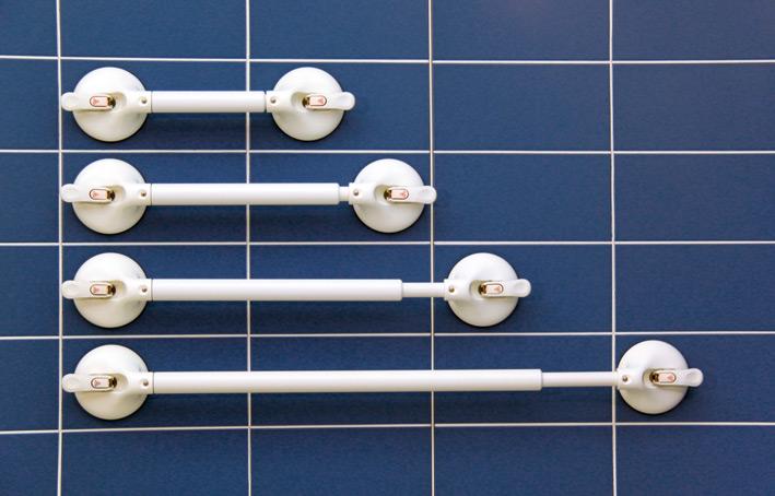 Roth Mobeli Teleskop-Haltegriffe sind in der Länge variierbar und daher vielseitig einsetzbar. Optional sind zusätzlich Gelenke montierbar. Durch die Gelenke können kleine Höhen-Unterschiede überbrückt werden, wenn z. B. ein Saugteller am Wannenbecken und der andere an der Kachelwand befestigt wird. Ebenso kann der Griff über Eck angebracht werden.