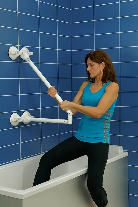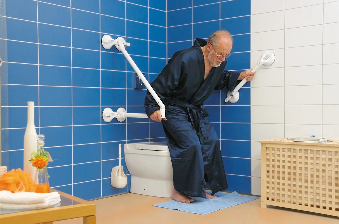 - Bringen Sie den Roth Stützhaltegriff mit Saugnäpfen neben der Toilette aufwärts oder abwärts an, so können Sie sich abstützen oder hochziehen und sich drehen.