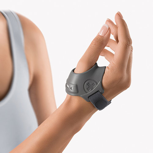 Die graue BORT RhizoFlex Daumen-Ringorthese dient zur Stabilisierung und Entlastung des Daumensattelgelenks.