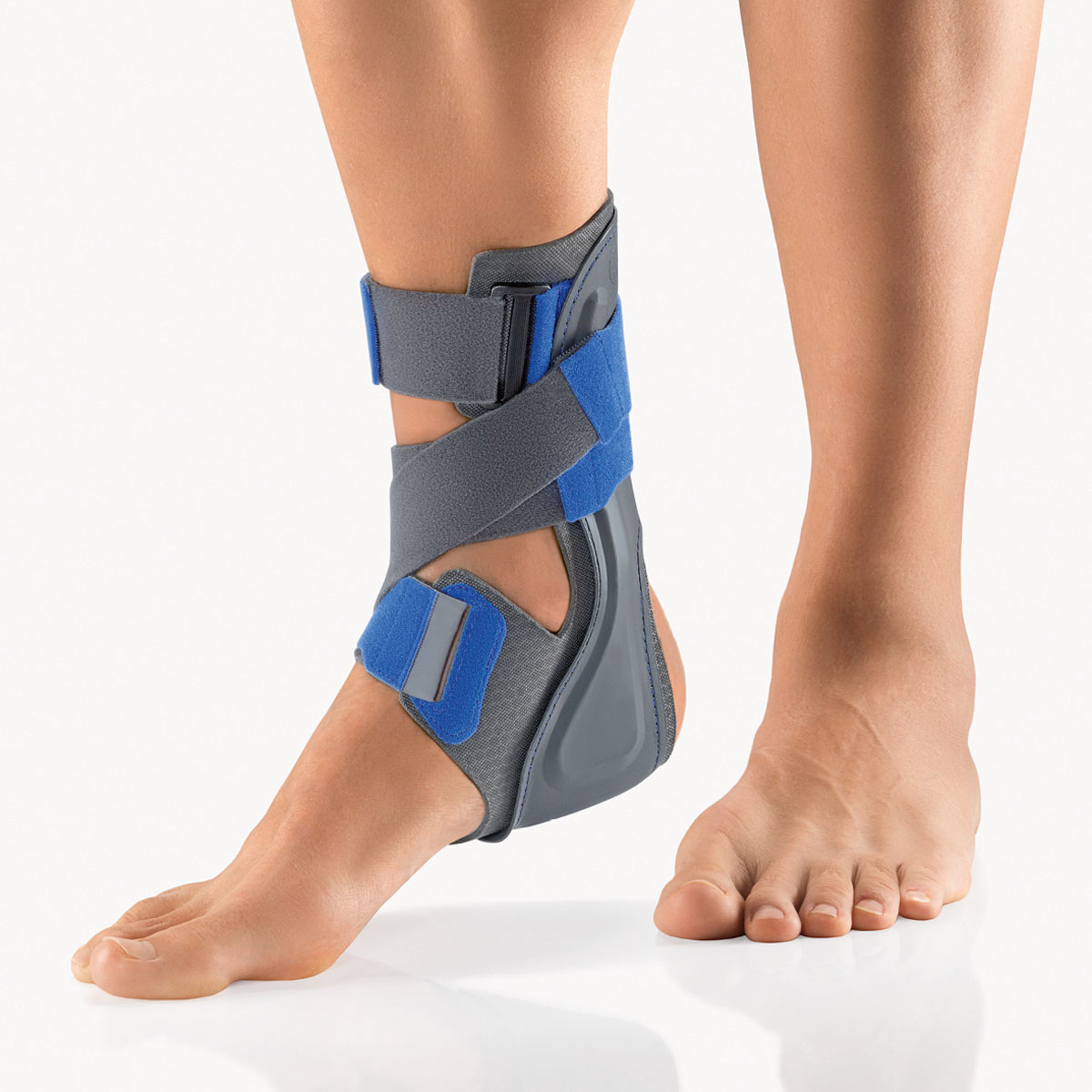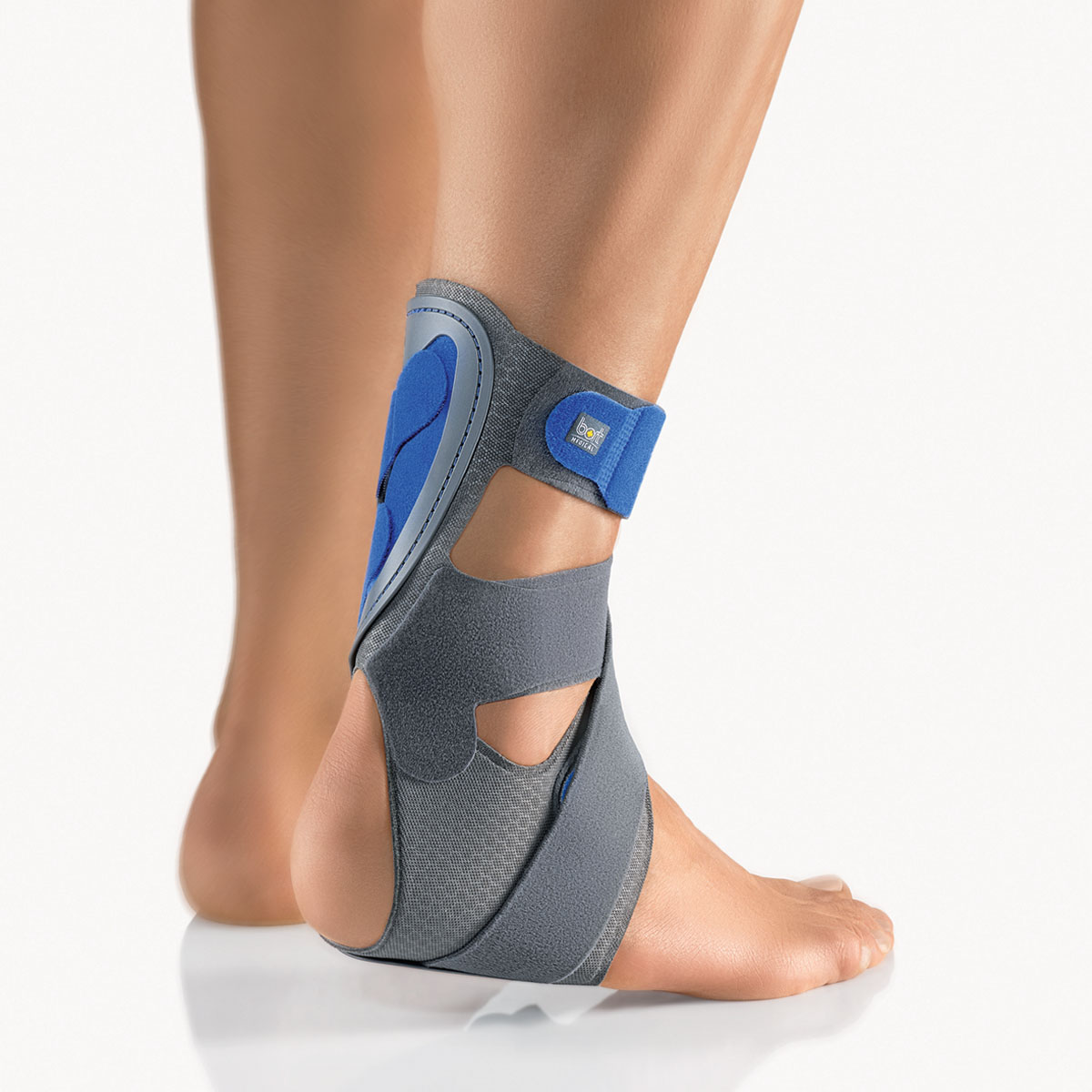 Die grau-blaue Sprunggelenkorthese Bort TaloXpress zur Stabilisierung des oberen und unteren Sprunggelenks. Die leichte Bort Orthese für das Sprunggelenk TaloXpress verfügt über eine mediale, anatomisch vorgeformte Orthesenschale und ein Zügelsystem für sehr hohe Stabilisierung. So können Sie die Supination eingrenzen und den Bandapparat entlasten. Durch das Zusammenwirken der Funktionselemente (Orthesenschale und Zügel) werden die Bänder und das Sprunggelenk optimal unterstützt.