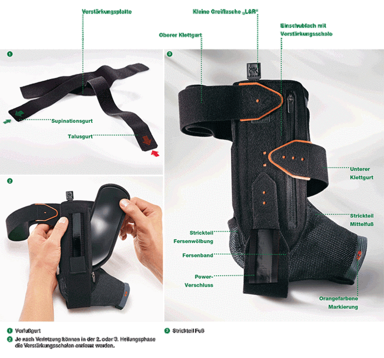 - Zirkuläre Gurte und Fersenband fixieren die Orthese
