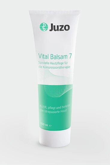 Die spezielle Hautpflege Juzo Vital Balsam 7 für die Kompressionstherapie ist ein besonders hautfreundliches Emulgel, das die Vorteile eines Gels mit den Eigenschaften einer Creme verbindet. Es wurde speziell für Menschen entwickelt, die Kompressionsbekleidung tragen: