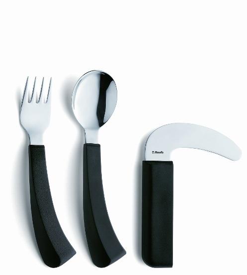 Die gebogenen Amefa-Besteckteile eignen sich besonders für Personen, deren Hand- und Gelenkbeweglichkeit eingeschränkt ist. Die Griffe laufen nach vorn hin zu und liegen gut in der Hand. Beim Amefa Messer ist die Messerklinge leicht gebogen. Das Amefa-Messer kann sowohl rechts als auch links gehalten werden. Die Amefa-Gabel ist sowohl für Rechts- als auch für Linkshänder erhältlich.