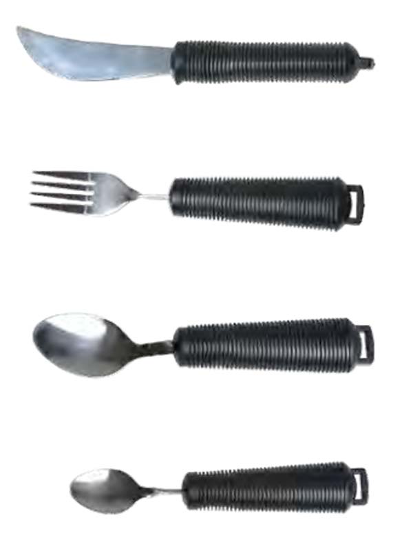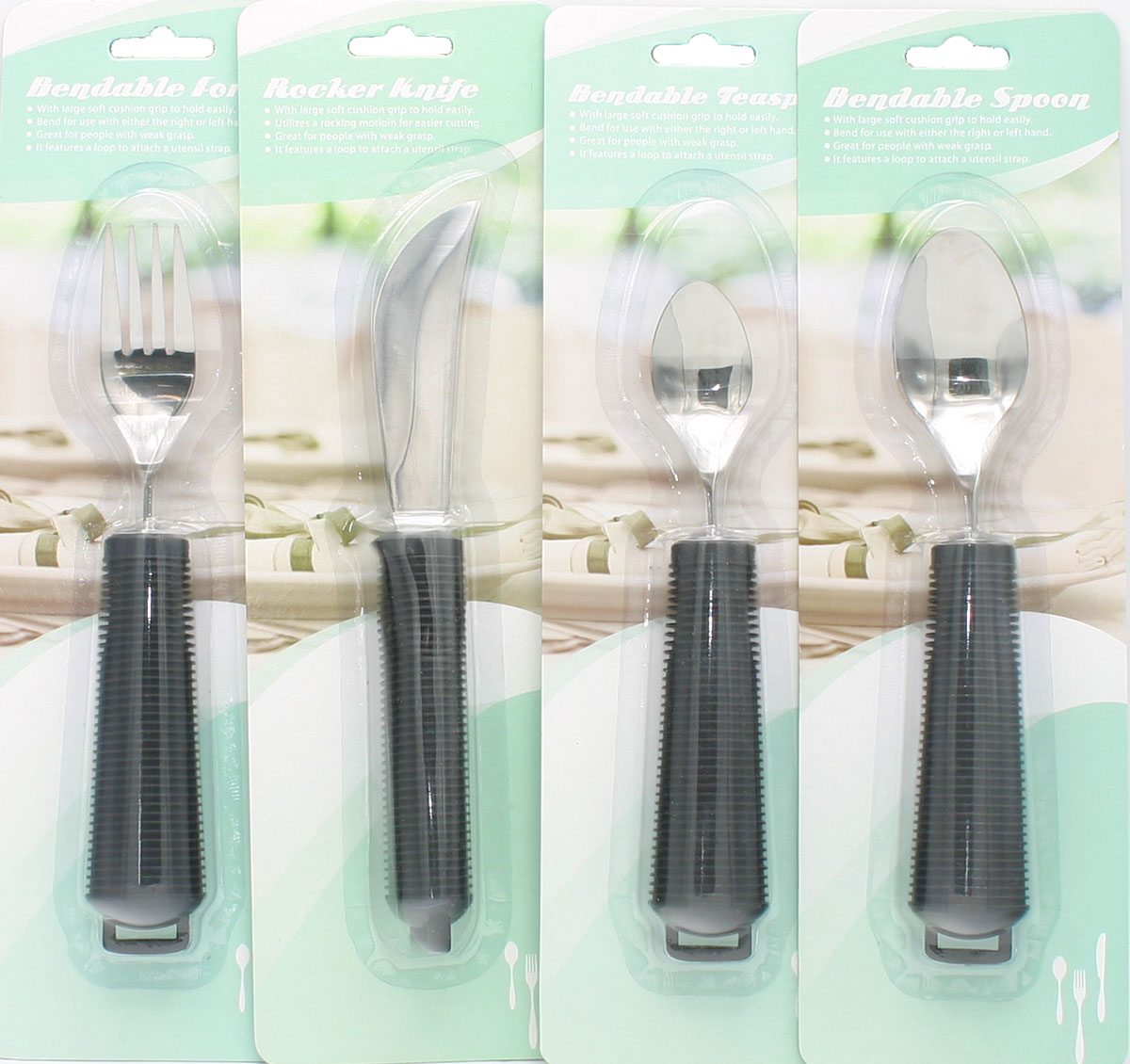Das biegsame 4-teilige Besteck-Set Flex ist mit ca. 3,0 cm dicken Vollgummigriffen ausgestattet. Sie sorgen für einen festen Halt, sind rutschsicher und liegen gut in der Hand. Dies erleichtert bei motorischer Einschränkung das Halten der einzelnen Besteckteile. Sind Sie in der Motorik eingeschränkt, haben Probleme in der Bewegung Ihrer Handgelenke, dann ist das Besteck-Set Flex die richtige Alternative für Sie. Alle zum Mund führenden Besteckteile lassen sich beim flexiblen Metallschaft entweder nach links oder rechts biegen. Dies dient der Entlastung der unterstützenden Person in der Pflege zu Hause und ermöglicht das selbstständige Essen der pflegenden Person.