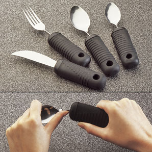 Erhältlich ist das Supergrip-Essbesteck als 4er-Set in der biegsamen oder in der starren-nicht biegsamen Ausführung.