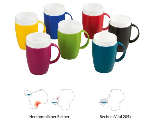 Speziell für Personen mit Bewegungseinschränkungen der oberen Extremitäten oder des Halswirbelbereiches entwickelt. Dieser Becher wird empfohlen vom „Expertenstandard Ernährungsmanagement“ (= Pflegestandard, beschreibt ein bestmögliches Qualitätsniveau) als innovatives und ideales Hilfsmittel in der Pflege.