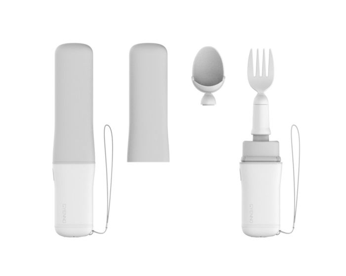 - Der Löffel- oder Gabelaufsatz kann auf die Halterung gesteckt und einfach getauscht werden.