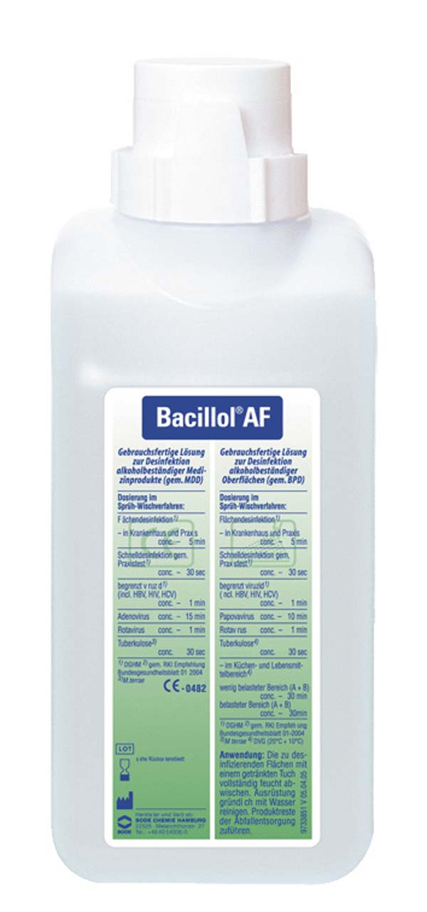 Das FlächendesinfektionsmittelBacillolAF500 ml ist ein aldehydfreies, alkoholisches Schnell-Desinfektionsmittel, aldehyd- und parfümfrei, trocknet rückstandsfrei aus. Sollte in der häuslichen Pflege nicht fehlen.