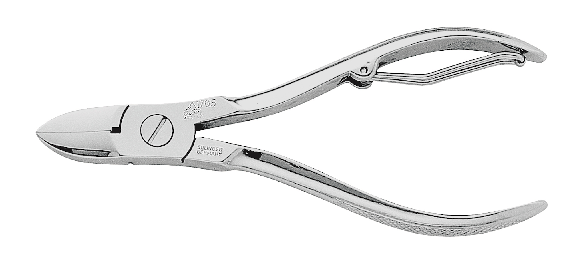 Die vernickelte Erbe-Nagelzange 12 cm mit aufgelegter, leicht gebogener 20 mm Schneide ist ausgestattet mit einer Klappfeder. Sie hat eine Gesamtlänge von 12 cm. Nagelzangen Kürzen starke Finger- oder Fußnägel ohne Kraftaufwand. Nach jedem Schneiden öffnet sich die Zange statt der Klappfeder selbst. Sie ist aus langlebigem, geschmiedeten Spezialstahl in Original Solinger Qualität hergestellt und von Meisterhand geschärft.