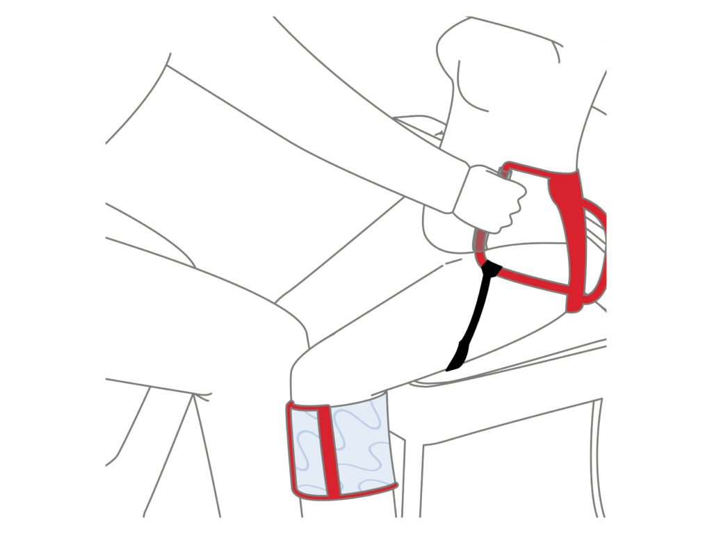 Der Alpha Beingurt wird auf Kniehöhe sanft um die Beine des sitzenden Patienten gelegt und mit dem Klettverschluss verbunden. Die Pflegekraft stellt jetzt ihren Fuß zwischen die Beine des Patienten, so dass sie mit ihrem Knie einen konsequenten Druck auf die Polsterung des Beingurtes ausüben kann. Der Beingurt unterstützt durch diese Sicherung das Stehvermögen des Patienten und erlaubt der Pflegekraft die Drehbewegung zu stabilisieren.