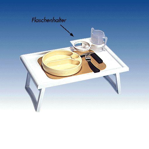 Der Betttisch mit Flaschenhalterung dient nicht nur bettlägerigen Personen beim Essen und Trinken im Bett. Er ist auch für andere Tätigkeiten während des Liegens oder Sitzens im Bett geeignet. Die seitlichen Tischbeine lassen sich fest einrasten, was ihm besondere Stabilität verleiht. Er wird inklusive einer passenden Halterung für Gläser und kleine Flaschen geliefert, die an jeder gewünschten Stelle der Tischplatten-Kante befestigt werden kann. Bei Nichtgebrauch kann der Tisch Platz sparend zusammengeklappt und verstaut werden.