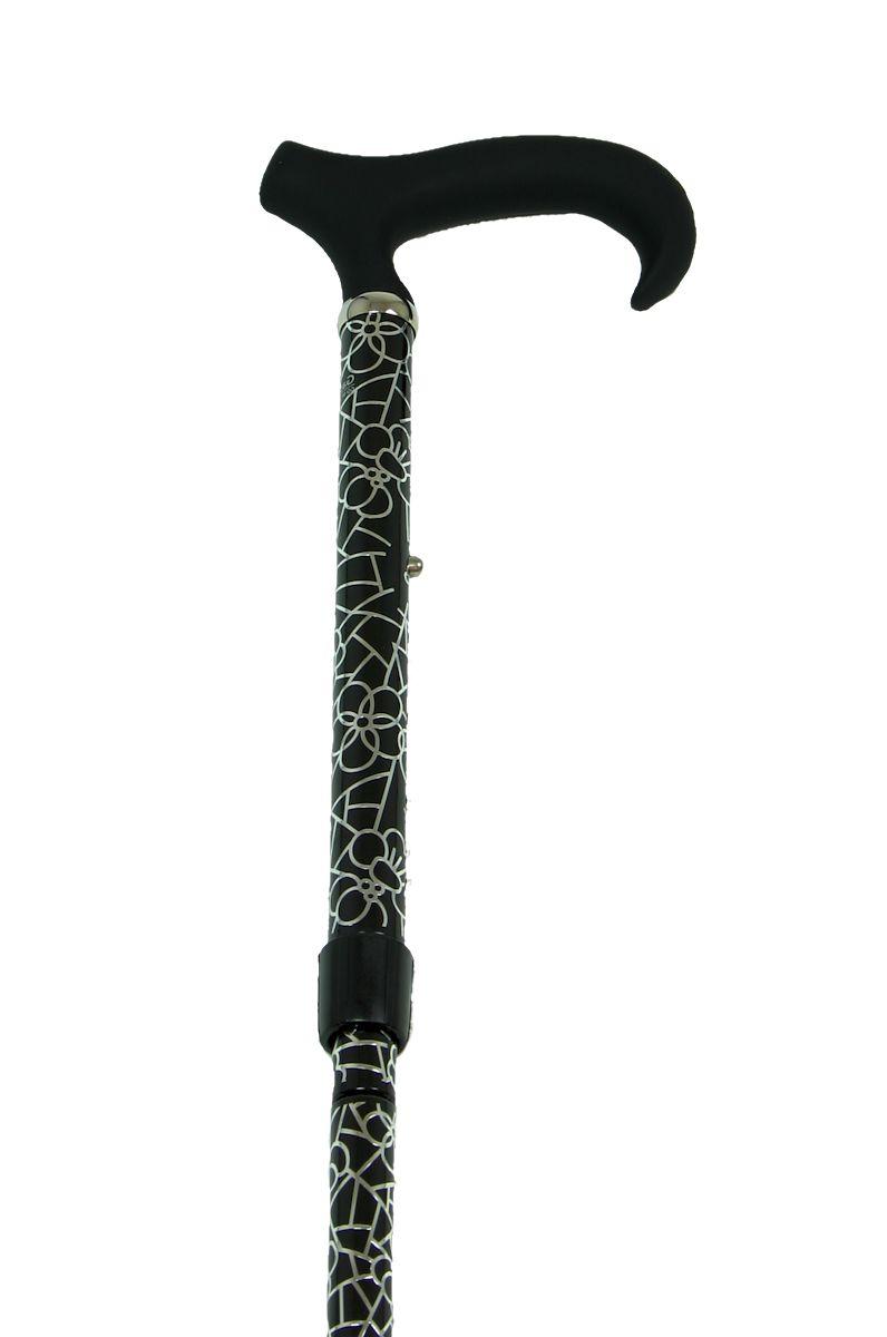 Der superleichte Faltstock Carbon-Schlank Filligran mit Soft-beschichtetem Acetat Neck-Derby-Handgriff und silbernem Filigranen Dekor auf dem schwarzen Schuss ist ein 4-teilig faltbarer Premium Gehstock für Damen aus dem Hause Gastrock. Ausgestattet mit Chromring und Gummipuffer mit Stahleinlage unterstützt der Handstock für Senioren Sie als Gehhilfe mit einem Eigengewicht von 255 g sicher bis zu einer Belastbarkeit von 100 kg. Die Griffhöhe lässt sich in 5 Stufen von 85 bis 95 cm über Druckknopf einstellen.