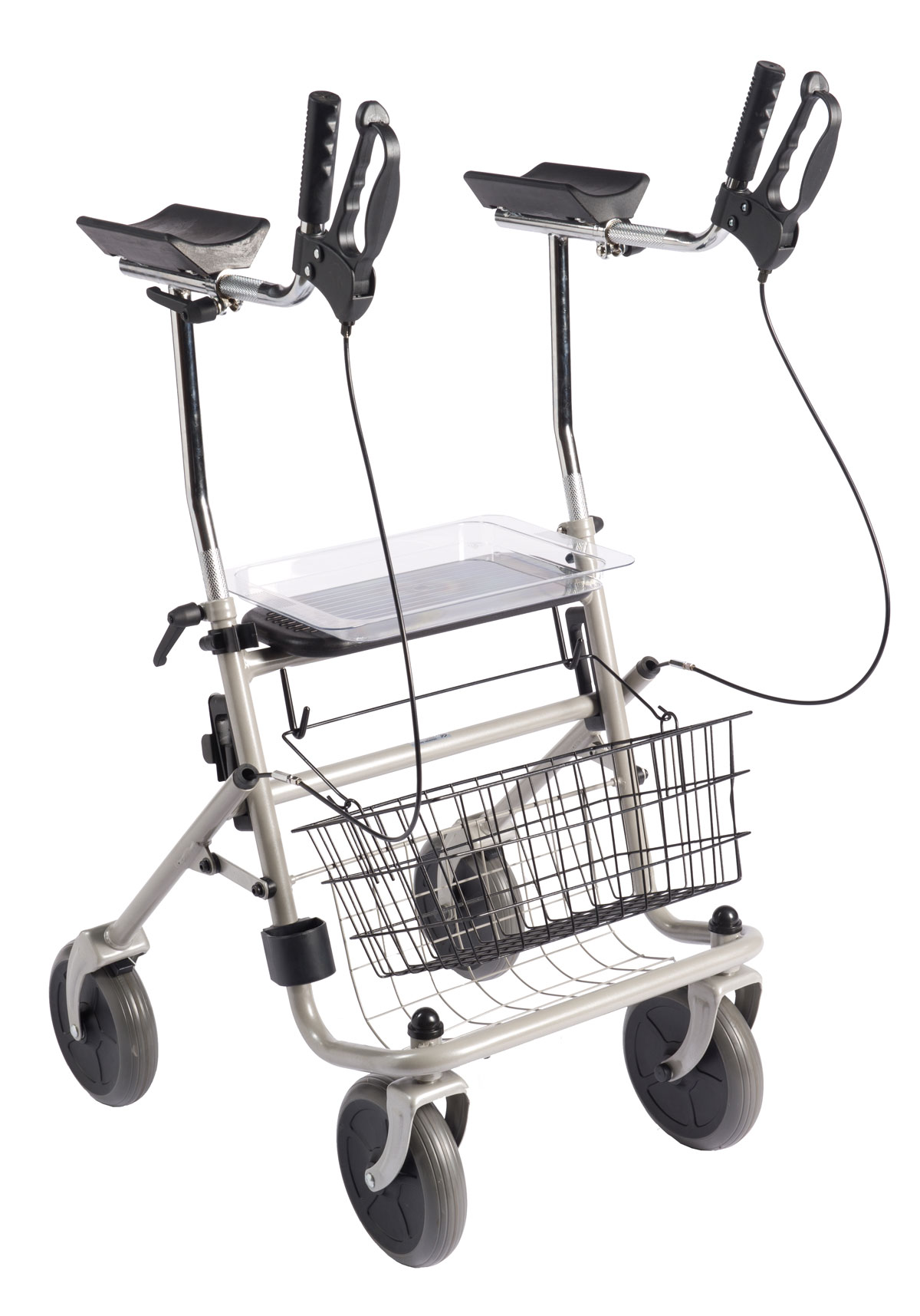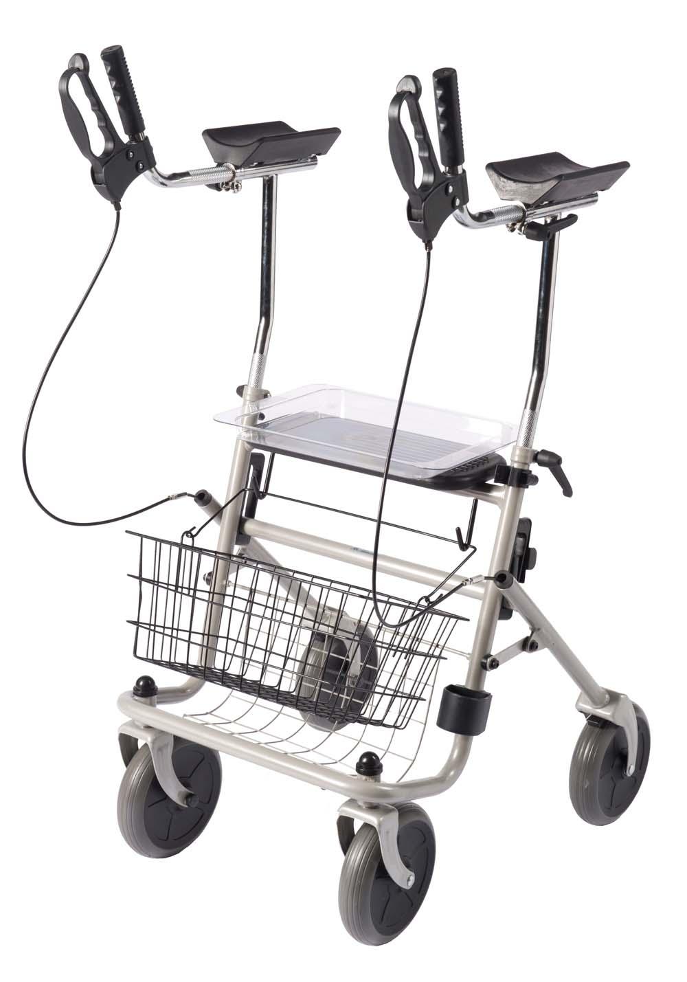 Rollator mit gepolsterten Unterarmauflagen inklusive Tablett, Einkaufskorb und Stockhalter