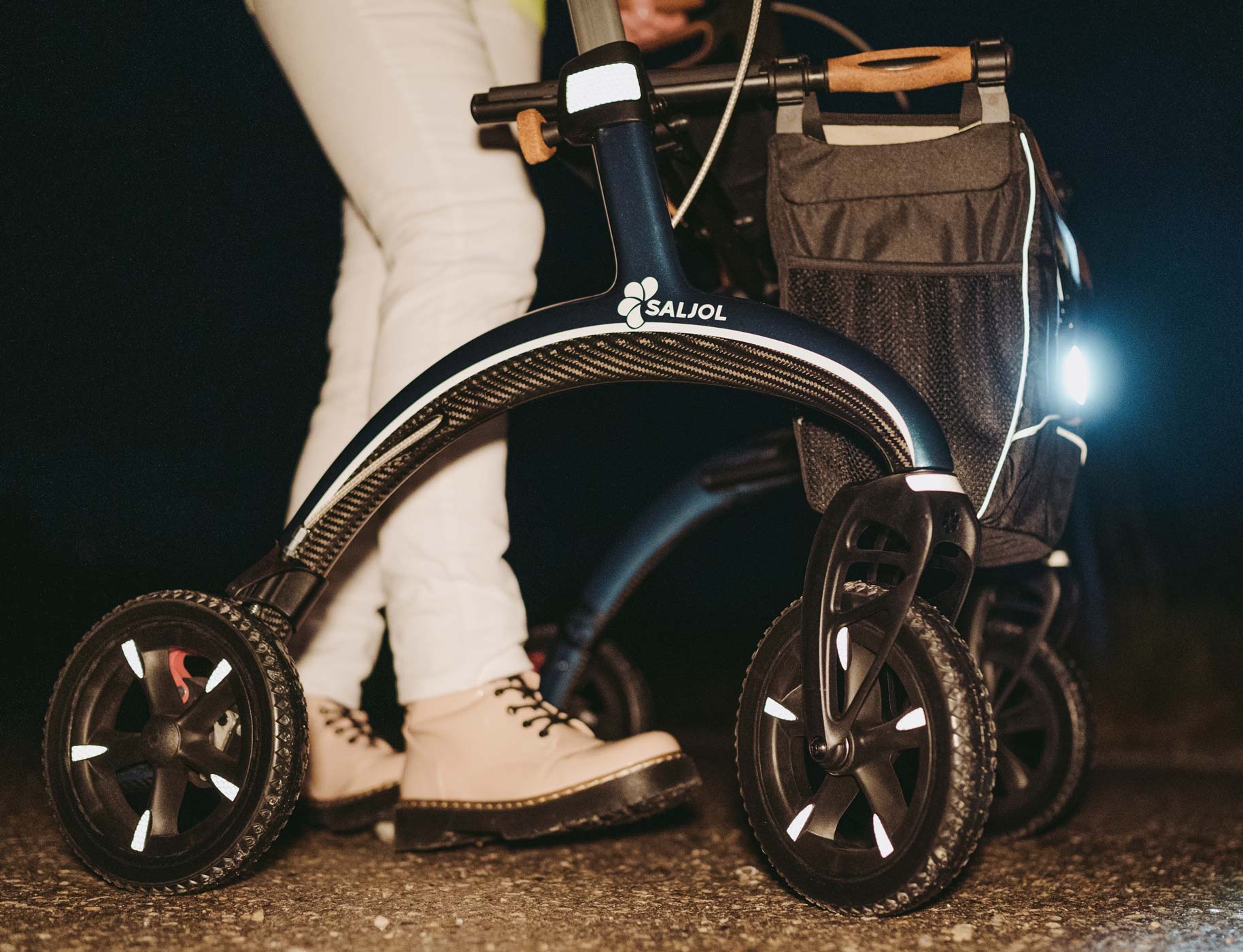 Mit seinen 30 Reflektor-Punkten am Rahmen, den Reifen, an den Griffen, an beiden Ankipphilfen und der Tasche wird der Saljol Carbon Rollator als mobile Gehhilfe im Straßenverkehr bei Dunkelheit aus jeder Richtung wahrgenommen.