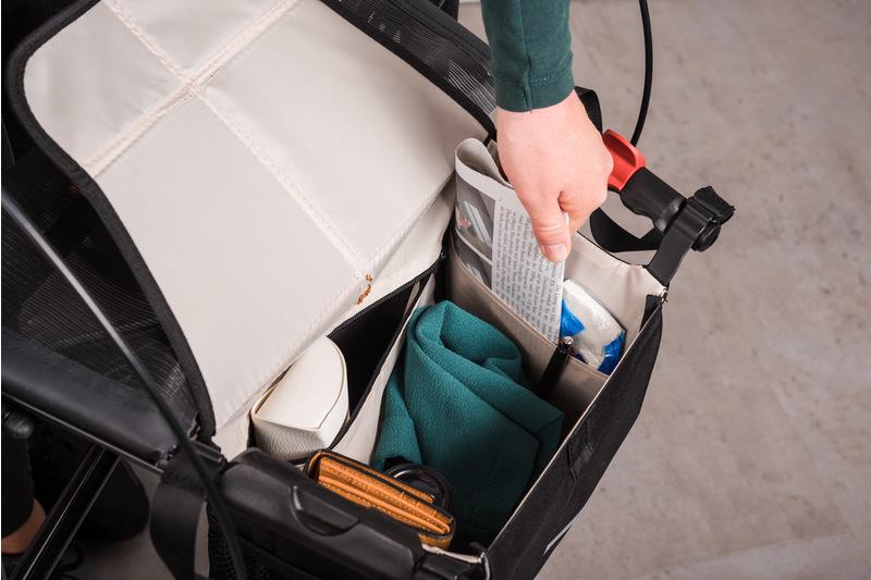 Die Einhand-Henkeltasche an den Befestigungsstangen ist hochwertig verarbeitet und besitzt oben auf der Abdeckung ein durchsichtiges Fach für Ihr Smartphone, so haben Sie Ihr Navigationssystem immer griffbereit. Die braune Kunstlederklappe schließt mit einem Magneten und erlaubt die Bedienung mit einer Hand, während sich die andere sicher auf dem Korkhandgriff des Rollators von Saljol aufstützt. Der matt schwarze Carbon Rollator wird mit einer schwarzen Stoff-Einkaufstasche mit Magnetverschluss geliefert. An den Seiten finden Sie Netze für Getränke oder Ihre Zeitung. Innen ist die Tasche hell und mit drei weiteren Fächern zum Organisieren und Einkaufen ausgestattet. Stecken Sie die Henkel während der Fahrt in die Tasche und Sie haben einen idealen Schutz vor Taschendieben.