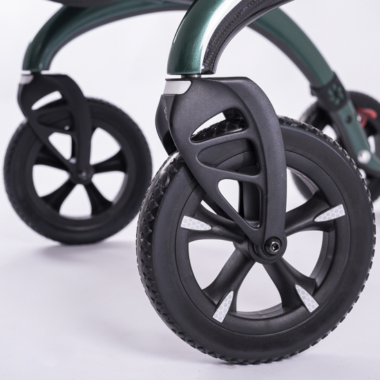 Das ausgeprägte Profil der weichen Super Soft All-Terrain Bereifung sorgt für mehr Grip, wenn Sie mit Ihrem Carbon Rollator von Saljol auf Schotter oder Wiesen unterwegs sind. Auf der mittleren Lauffläche glatt und mit viel Bremskraft und an den Rändern mit Profil, das auf weichem Untergrund mehr Stabilität und Seitenhalt bewirkt.