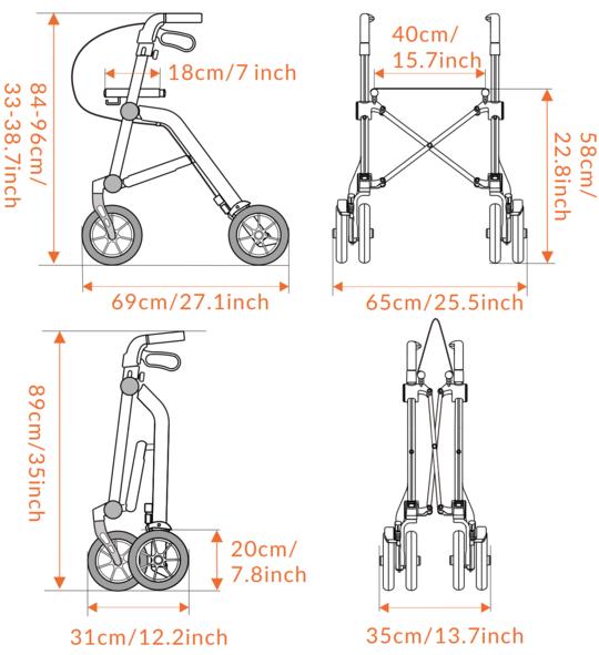 - Längs- und seitlich zusammenklappbar, nimmt er im Auto oder in der Garage nur einen kleinen quadratischen Platz ein.