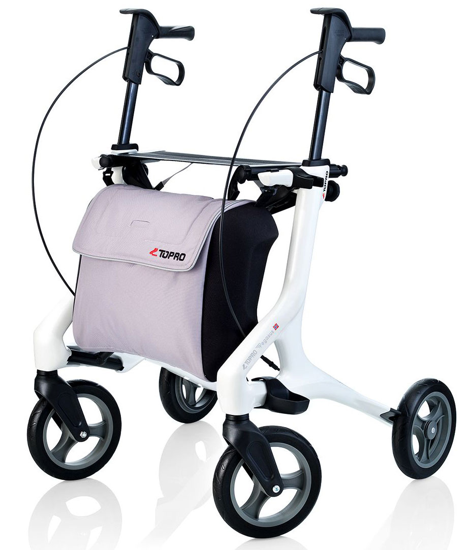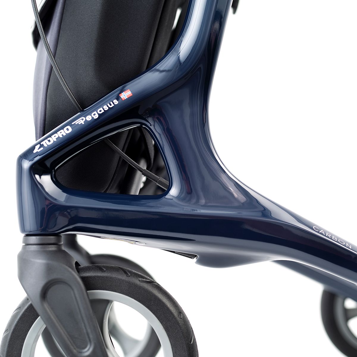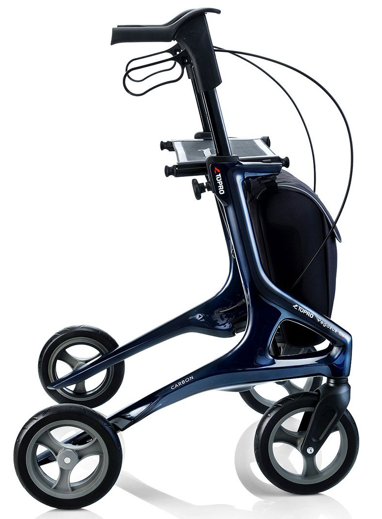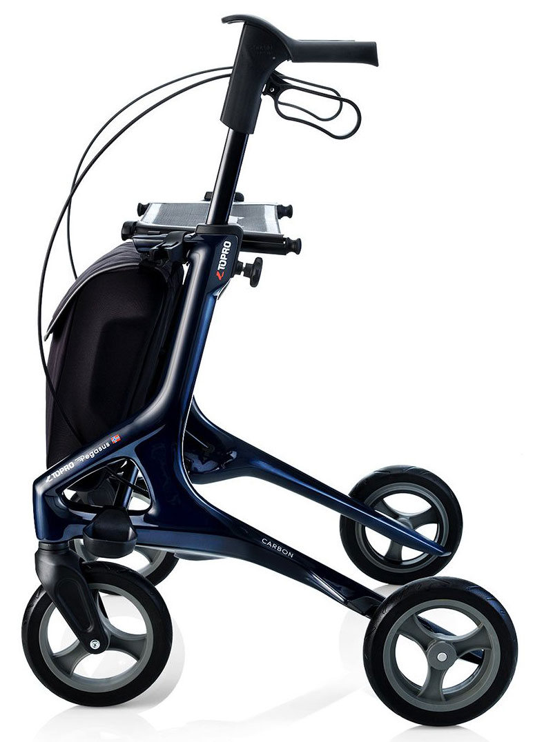 Der Topro Pegasus Carbon Rollator mit einer Sitzhöhe von 63 cm bietet Nutzern ab 1,65 m sicheres Gehen. Die modernen Gehhilfen aus Norwegen haben einen Carbonrahmen aus sehr leichter, stromlinienförmig gestalteter Kohlefaser in den Rahmenfarben Weinrot, Stahlblau oder Weiß und werden inklusive der Finger entlastenden Ergo-Grip Handgriffe, einer bis 10 kg belastbaren, abnehmbaren Tasche und zum Teil innenliegenden Bowdenzügen geliefert.