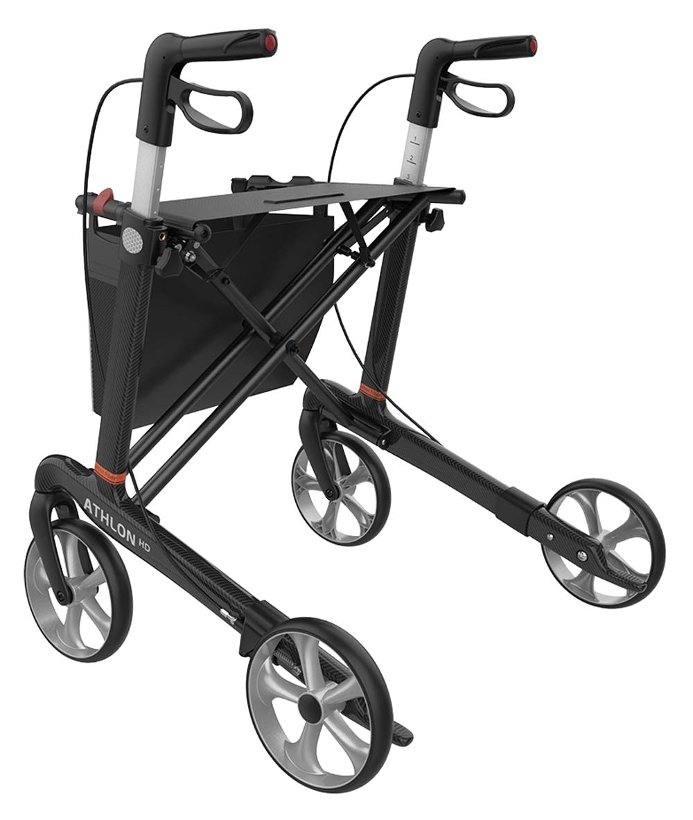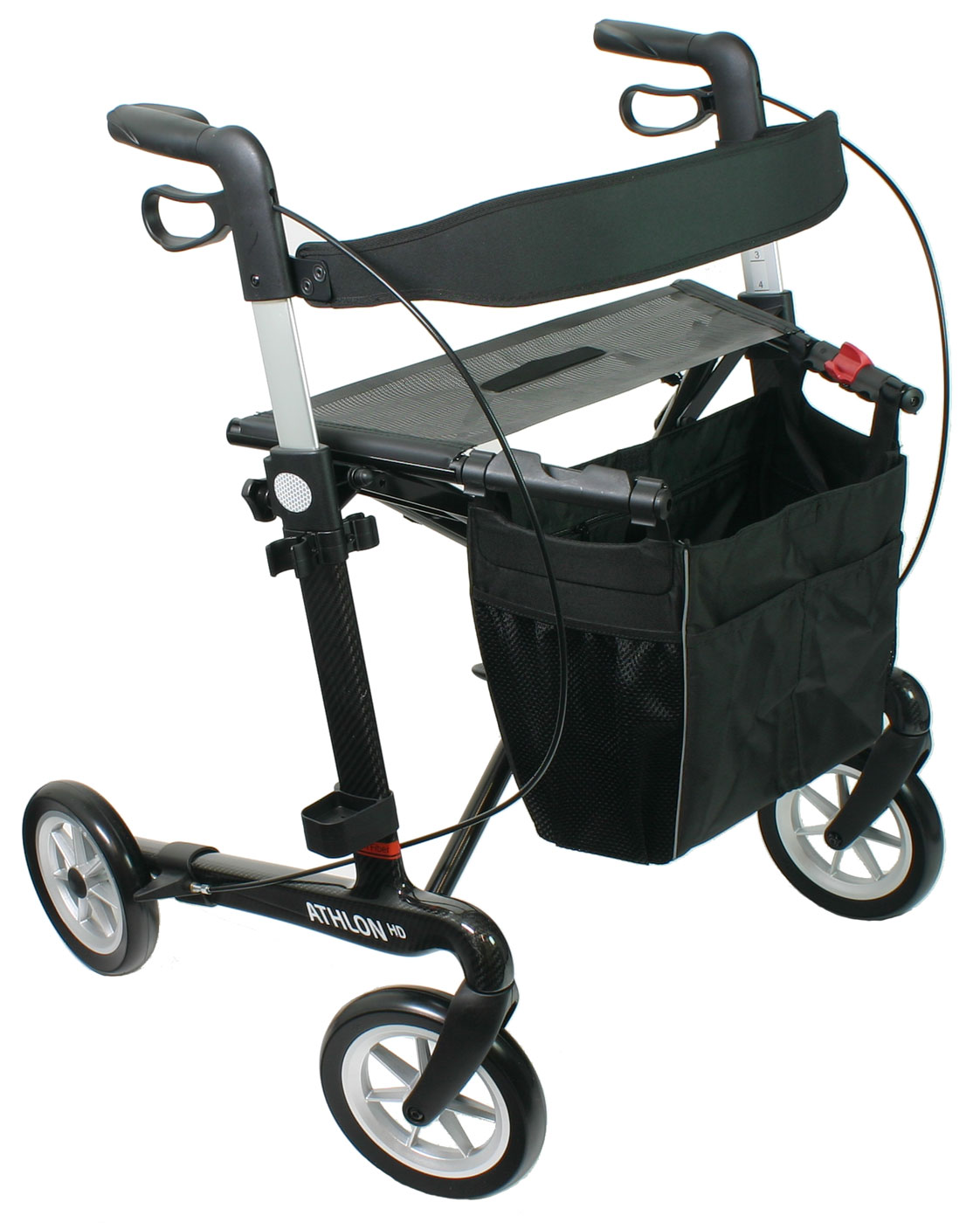 Als Carbon Rollator Athlon HD mit weicher Komfort-Soft-Bereifung inklusive Einkaufsnetz und einem Stockhalter