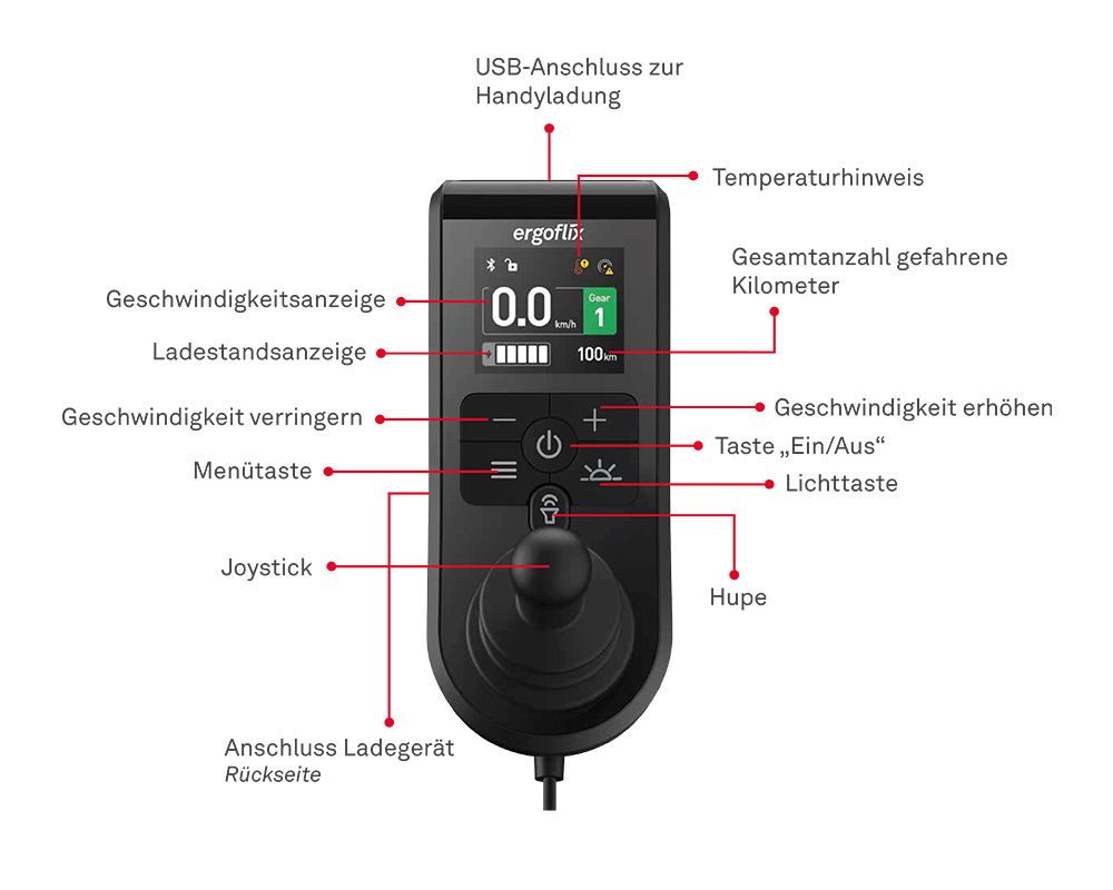 Das intuitive Bedienmodul mit seinem modernen LCD-Farbdisplay bietet Ihnen umfassende Kontrolle und wichtige Informationen auf einen Blick: Neben der aktuellen Geschwindigkeit werden Ihnen der Ladestand der Akkus und die bereits gefahrenen Kilometer digital angezeigt. Ein praktischer USB-Anschluss am Bedienmodul ermöglicht es Ihnen sogar, Ihr Smartphone bequem unterwegs zu laden. Besonders anpassungsfähig: Das Bedienmodul kann nach Belieben an beiden Armlehnen angebracht werden. Zudem gewährleistet der Ergoflix Carbon ein ruhiges Fahrverhalten mit einem extrem leisen Antriebsgeräusch, was zu einem angenehmen Fahrerlebnis beiträgt. Für Begleitpersonen ist optional ein Bedienmodul-Adapter erhältlich, der eine einfache Steuerung von außen ermöglicht. - Sicherheit & Beleuchtung