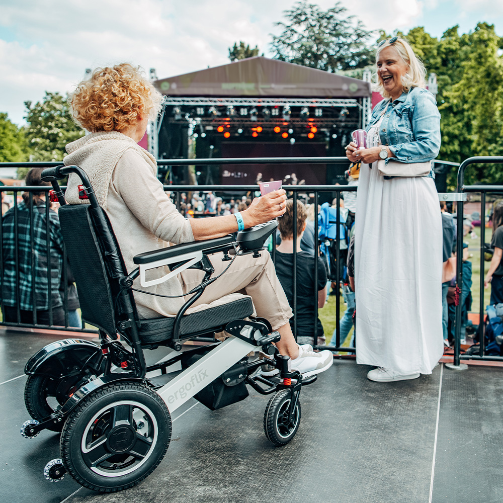 Die Kombination aus hohem Komfort und Leichtbau macht den faltbaren Elektrorollstuhl Ergoflix zu einem echten Allrounder für drinnen und draußen.