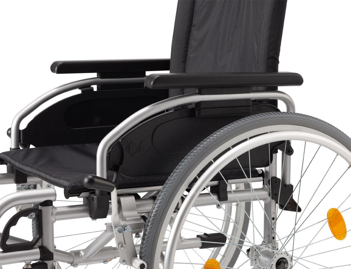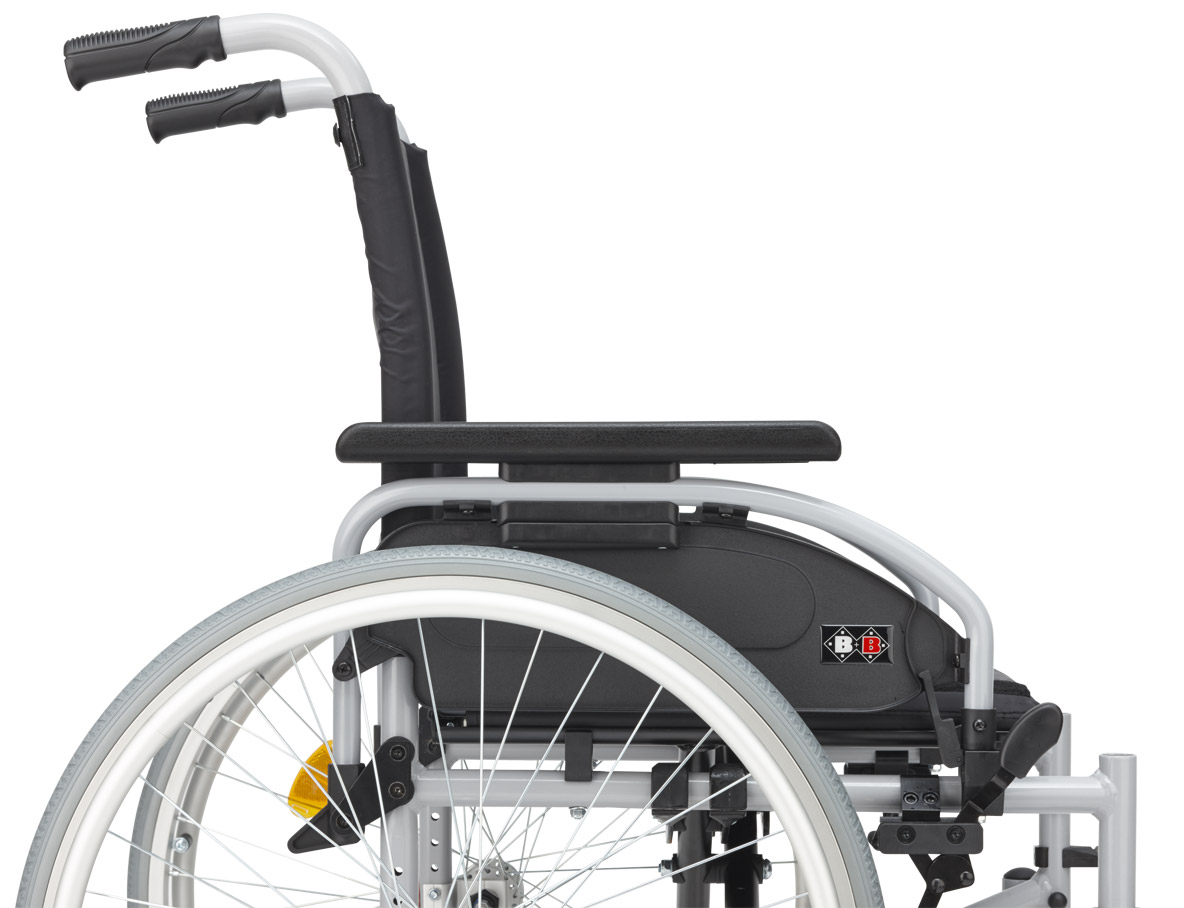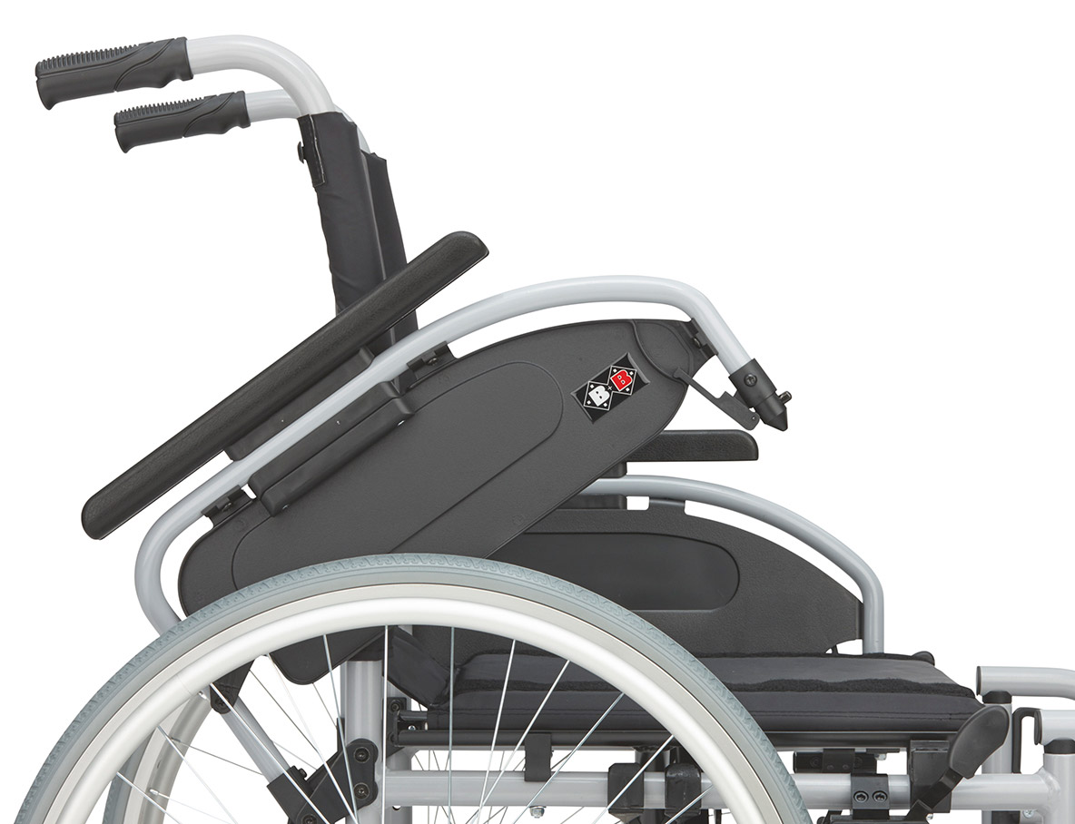 Viele Anpassmöglichkeiten gleich in der Basisausstattung bieten Ihnen entspannten Sitzkomfort beim längeren Verweilen im leichten Rollstuhl Pyro Start Plus und die richtige Entlastung für die schiebende Person und die helfende Hand während der Pflege zu Hause.
