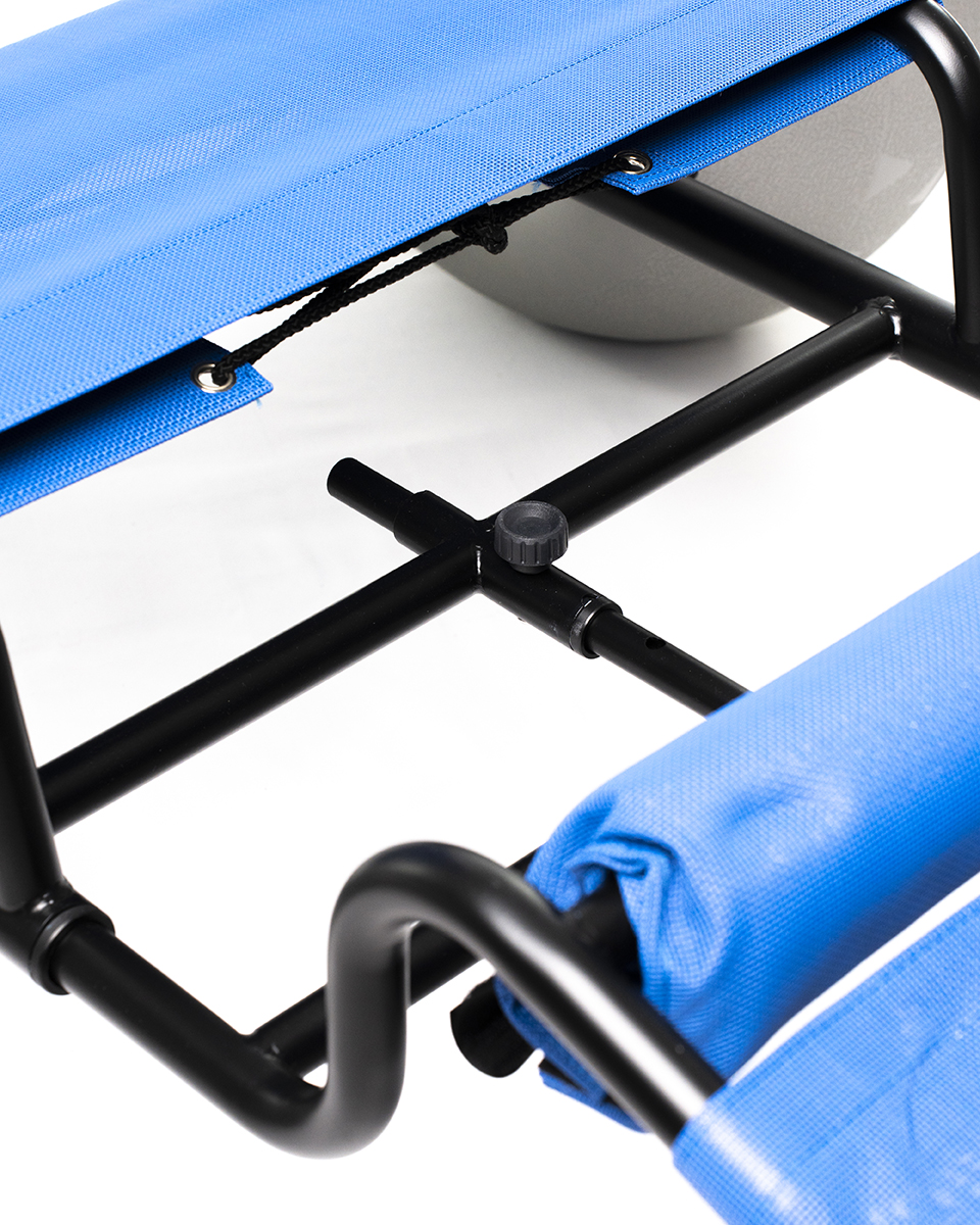 Die Befestigung ist einfach, die Griffe befinden sich an der Basis an zwei verschiedenen Punkten - seitlich und frontal - und ermöglichen es, den Stuhl einfach und wie einen einzigen Block am Brett zu befestigen. Verwenden Sie die Kabel, indem Sie die Haken befestigen und die Spannung der Kabel auf den vollen Griff einstellen. - Vordere Stuhlstütze im Sand