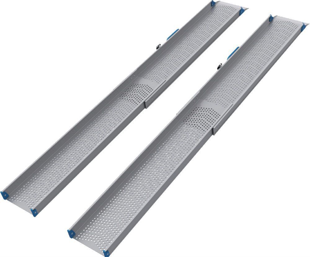 Die Mobile Profil-Rampe, teleskopisch ist in 2 Ausführung erhältlich. Wählen Sie je nach Steigung die richtige Rampe aus. Sie kann vielseitig im Haus und im Freien einsetzt werden. Das perforierte und strukturierte Oberflächenprofil sorgt für Sicherheit und Rutschfestigkeit beim Befahren. Zur Aufbewahrung kann die Rampe zusammengeschoben und an den praktisch integrierten Haltegriffen leicht transportiert werden.