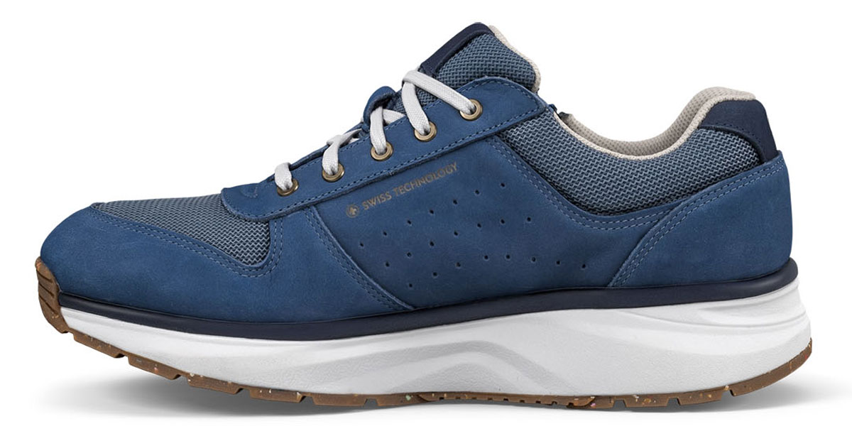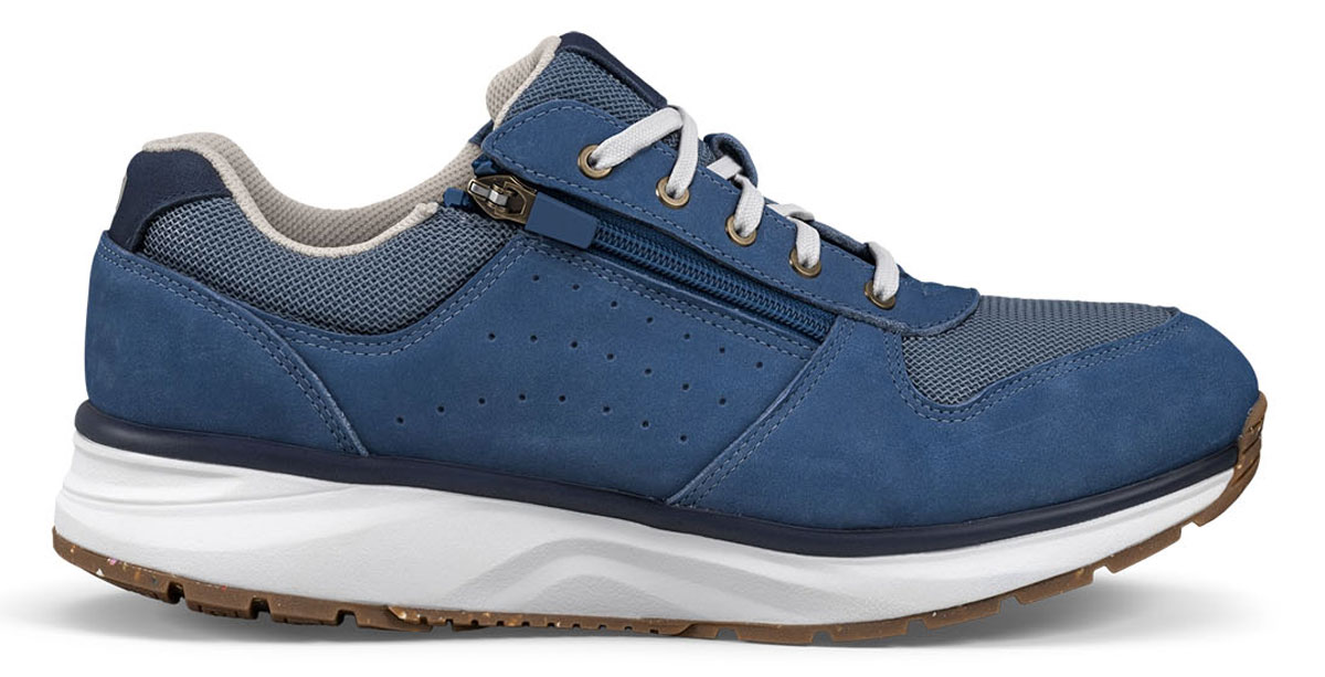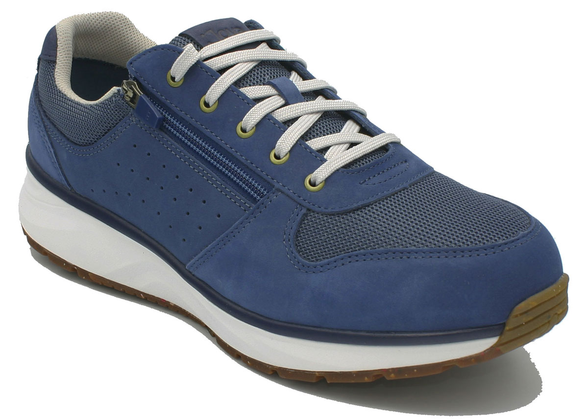 Weich gedämpfte Herren Schuhe Joya Dynamo Zip M Blue in bequeme Weite H und einem Obermaterial aus anschmiegsamen Nubukleder- und Mesh entlasten mit ihren elastischen, stabil gehenden Active-Sohlen Ihre Gelenke und entspannen den Rücken bei allen lauffreudigen Aktivitäten. Das besonders weiche Auftreten mit den bequemen Joya Gesundheitsschuhen für Männer bietet Ihnen das entspannte Laufgefühl eines Spazierganges am sandigen Meeresufer mit guter Fersenstabilität und entlastet schmerzende Füße. Die modischen blauen Schnürschuhe für Herren sind Sneaker im Retro-Look mit zusätzlichem Reißverschluss für einen leichten Einstieg. Einmal richtig geschnürt, können Sie zukünftig Ihre Joya Schuhe Dynamo Zip M Blue mit seitlichem Zip leicht und zügig an- und ausziehen.