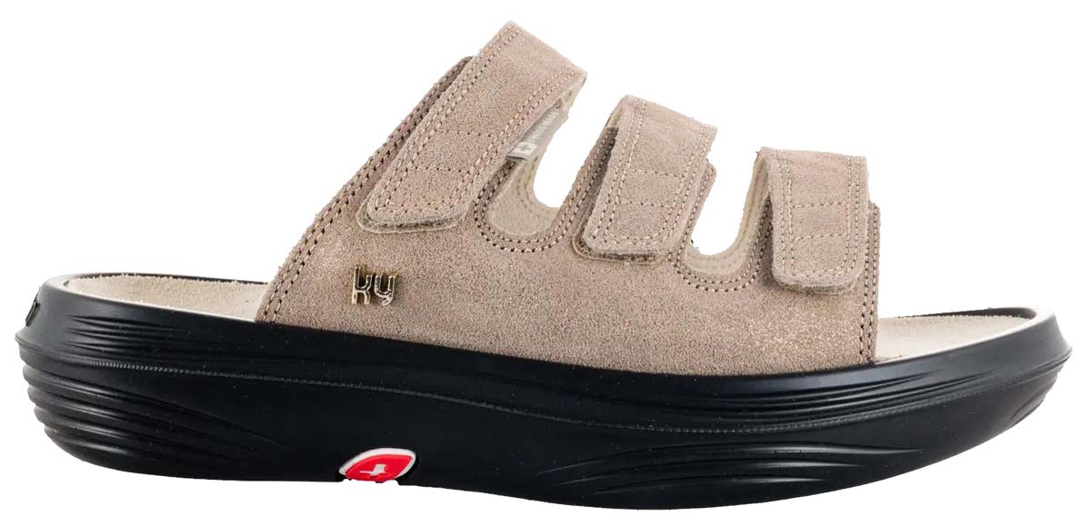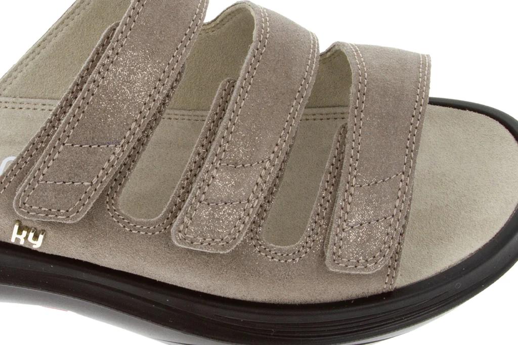 Die luftigen Damen Pantoletten Kybun Kriens Sand Sparkle W mit Tropo Luftkissensohlen sind Ihre Allrounder in Bequemweite H als Hausschuhe oder Freizeitschuhe für den Sommer im trendigen sandfarbenen, weichen Wildleder im zarten Glanz. Die drei flexibel einstellbaren Klettriemen lassen sich über dem Rist individuell dem Fuß anpassen und geben Ihnen sicheren Halt, wenn Sie im Kybun Luftkissenschuh gehen.