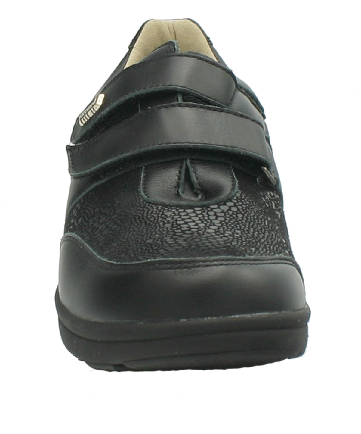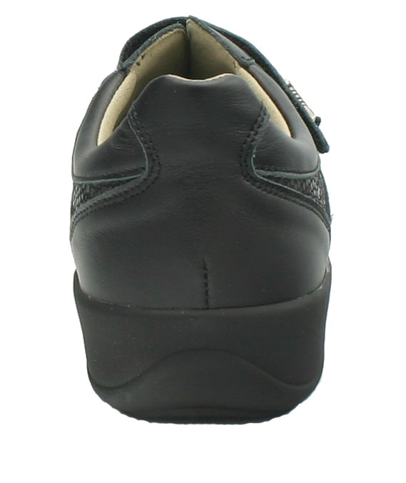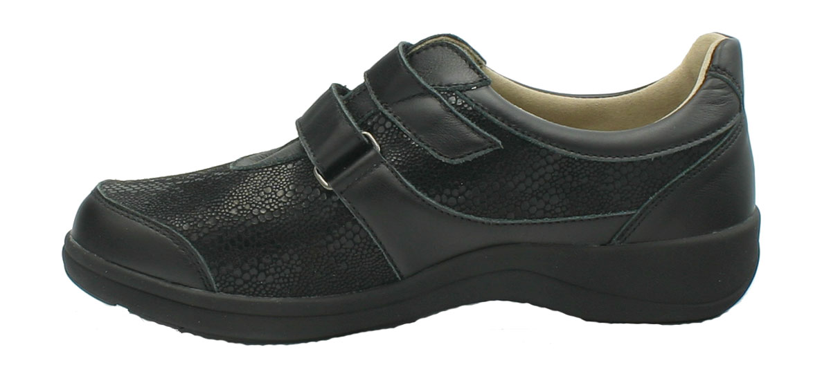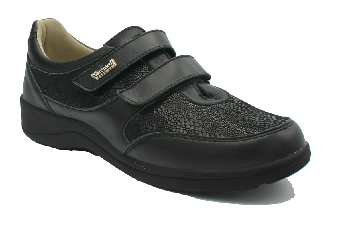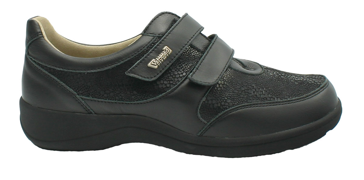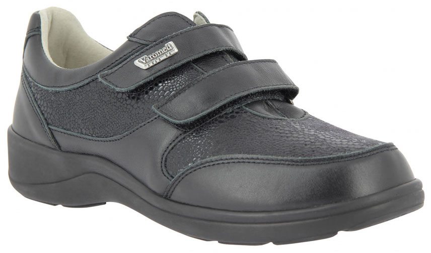 Die weich abgepolsterten Damen Schuhe Varomed Madrid schwarz in der leichten Überweite H 1/2 sind Gesundheitsschuhe für sensible, schmerzende Füße aus weichem Leder. Sie bieten dank der 2 Klettverschlüsse eine optimale Weitenregulierung. Das weich gepolsterte Vorderblatt aus Stretch sorgt für eine perfekte Anpassung an Ihren Vorfuß. Mit seiner angepassten Vorfußweite in H 1/2 ist er hilfreich auch bei ausgeprägtem Hallux Valgus. Varomed Gesundheitsschuhe sind im Innenbereich weitgehends ohne störende Nähte und extra weich gearbeitet. Er schmiegt sich deshalb angenehm an Ihren Fuß. Die Schuheinlage ist wechselbar und der bequeme Varomed Damenschuh bietet Platz für Ihre individuell angefertigten Schuheinlagen.