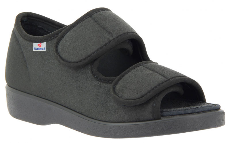 Die offenen Verbandschuhe Varomed Malmö schwarz besitzen als klassische Verbandsandalen mit hervorragenden Trageeigenschaften die Weite L, haben ein Obermaterial aus Microvelours mit hygienischem Vliesfutter und sind für den sicheren Gang mit einer festen Hinterkappe ausgestattet, die für einen stabilen Halt und guten Fersensitz sorgt. Für Wunden, Schwellungen oder Schmerzen am Fuß lassen sich die Verbandsandalen Varomed Malmö im Vorfuß komplett öffnen. Ihre zwei verstellbaren Klettverschlüsse erlauben das individuelle sichere Feststellen der medizinischen Gesundheitsschuhe am Fuß auch von umfangreichen Verbänden. Die herausnehmbaren 6 mm, mit Frottee bezogenen Weichschaumeinlagen ermöglichen die Nutzung Ihrer persönlichen Einlagen.
