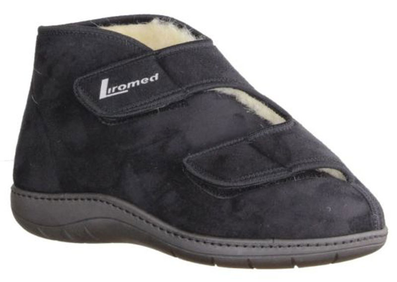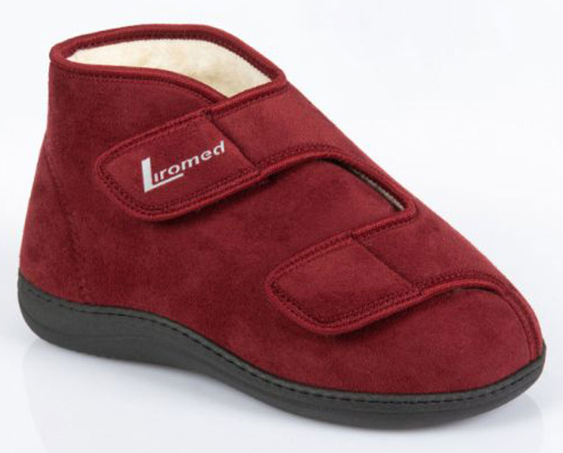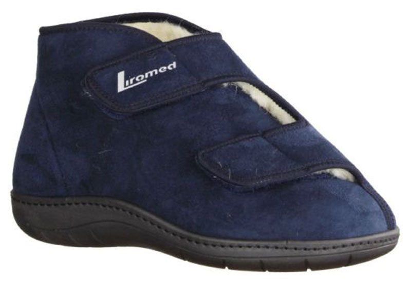 Die extra warmen Verbandschuhe Liromed 477 Schurwolle in den Farben schwarz, bordo oder blau mit herausnehmbarem Fußbett umschließen Ihre Knöchel wärmend mit 11 cm hohem Schaft und bieten als medizinische Therapieschuhe draußen oder im Wohnbereich als Hausschuhe angenehmen, sicheren Tragekomfort für Ihre empfindlichen, geschwollenen oder verbundenen Füße. Die medizinischen Schuhe Liromed 477 in Weite L besitzen ein weiches Obermaterial aus Mikrofaser und ein Innenfutter aus 100 % Schurwolle. Eine spezielle Membran im Zwischenfutter sorgt für den schnellen Transport von Feuchtigkeit nach außen und eine optimale Luftzirkulation. Die weichen Materialien lassen sich gut individuell der Passform des Fußes über die beiden Klettverschlüsse anpassen. Liromed 477 Verbandschuhe mit Schurwolle aus dem Sanitätshaus können zum Einstieg weit geöffnet werden.